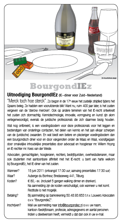 het zuiden zich stormachtig. Kennistechnologie, innovatie, vormgeving en kunst zijn alom vertegenwoordigd, evenals de juridische professionals die zich daarmee bezig houden. Wat nog ontbreekt, is een voedingsbodem voor deze professionals voor het leggen en bestendigen van onderlinge contacten, het delen van kennis en het aan elkaar scherpen van de (juridische) zwaarden. En wat biedt een betere en plezieriger voedingsbodem dan een bourgondisch diner voor en door vakgenoten onder de Maas en Waal, voorafgegaan door smakelijke inhoudelijke presentaties door advocaat en hoogleraar mr. Willem Hoyng en IE-rechter mr. Kees van der Weide.