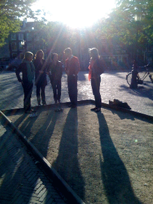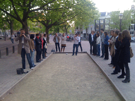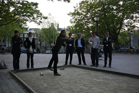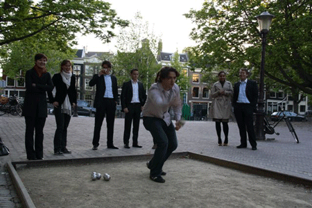En op het prachtige Amstelveld kwamen een kleine 50 zich jong voelende IE-vakgenoten bijeen om zich lezingloos onledig te houden met potjes pétanque en pils. Het Jong IE Jeu de Boules Extravaganza 2010 kon beginnen.